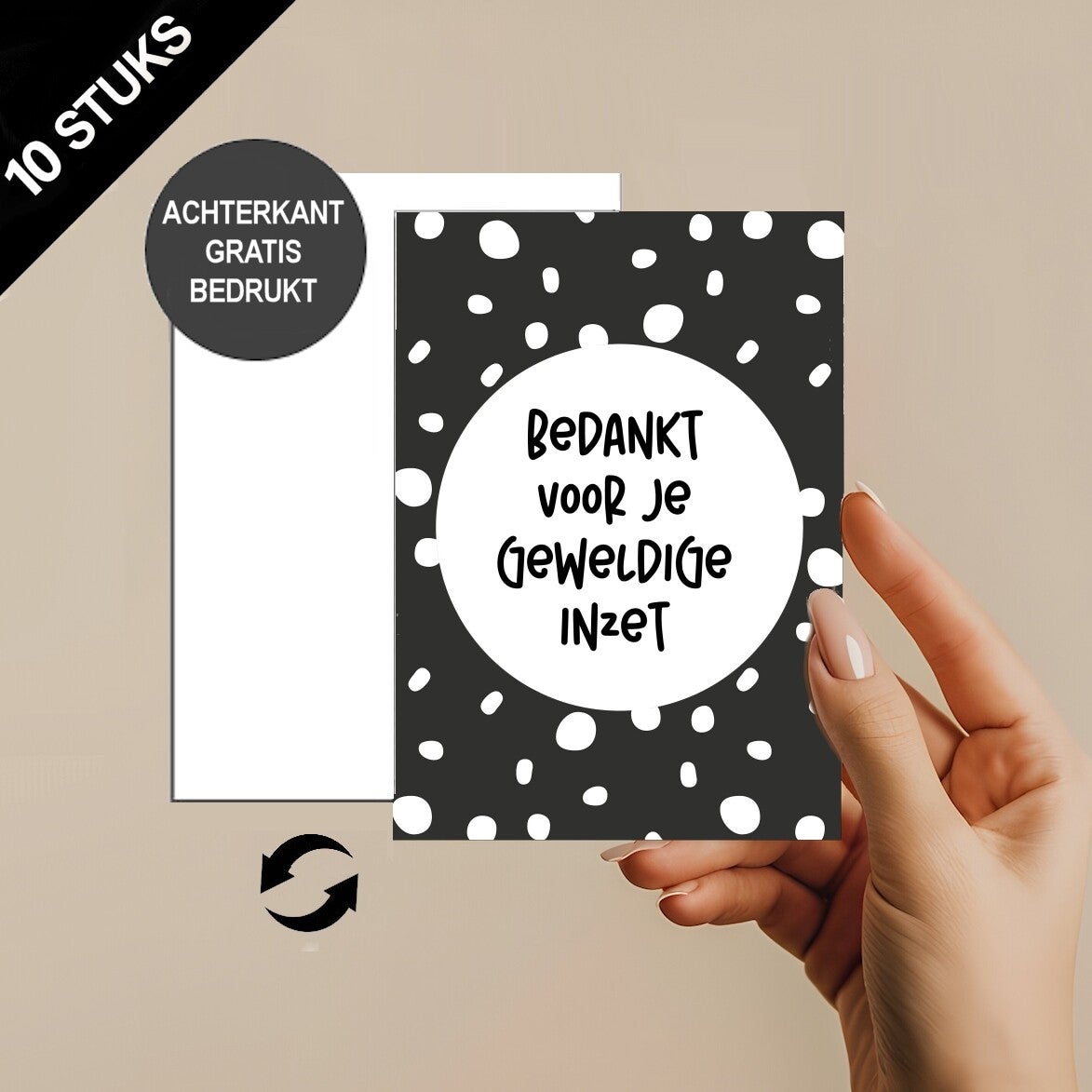 Bedankt kaarten met tekst, bedankt voor je geweldige inzet, Te gebruiken als bedankjes voor collega's in de zorg, evenementen, bedrijven enz. Daarnaast zijn deze kaarten ook perfect geschikt om vrijwilligers te bedanken, bij verschillende activiteiten, projecten en gemeenschappen, en een persoonlijke bedankkaart is een eenvoudige maar krachtige manier om hun toegewijde inzet en onmisbare bijdrage extra in het zonnetje te zetten. Een klein gebaar met grote impact! Trendy betaalbare wenskaarten voor uitdelen en weggeven. Handige cadeau kaarten om cadeau te doen of toe te voegen aan een leuke presentjes. Deze kaarten zijn erg leuk om zo te verkopen of als set met andere kaartjes. Geschikt voor particulieren, bedrijven, winkels en webshops. Prijs is vanaf 10 stuks, koop meer en betaal minder. Formaat: A6 formaat. 10,5 x 14,8 cm - enkele kaarten.
