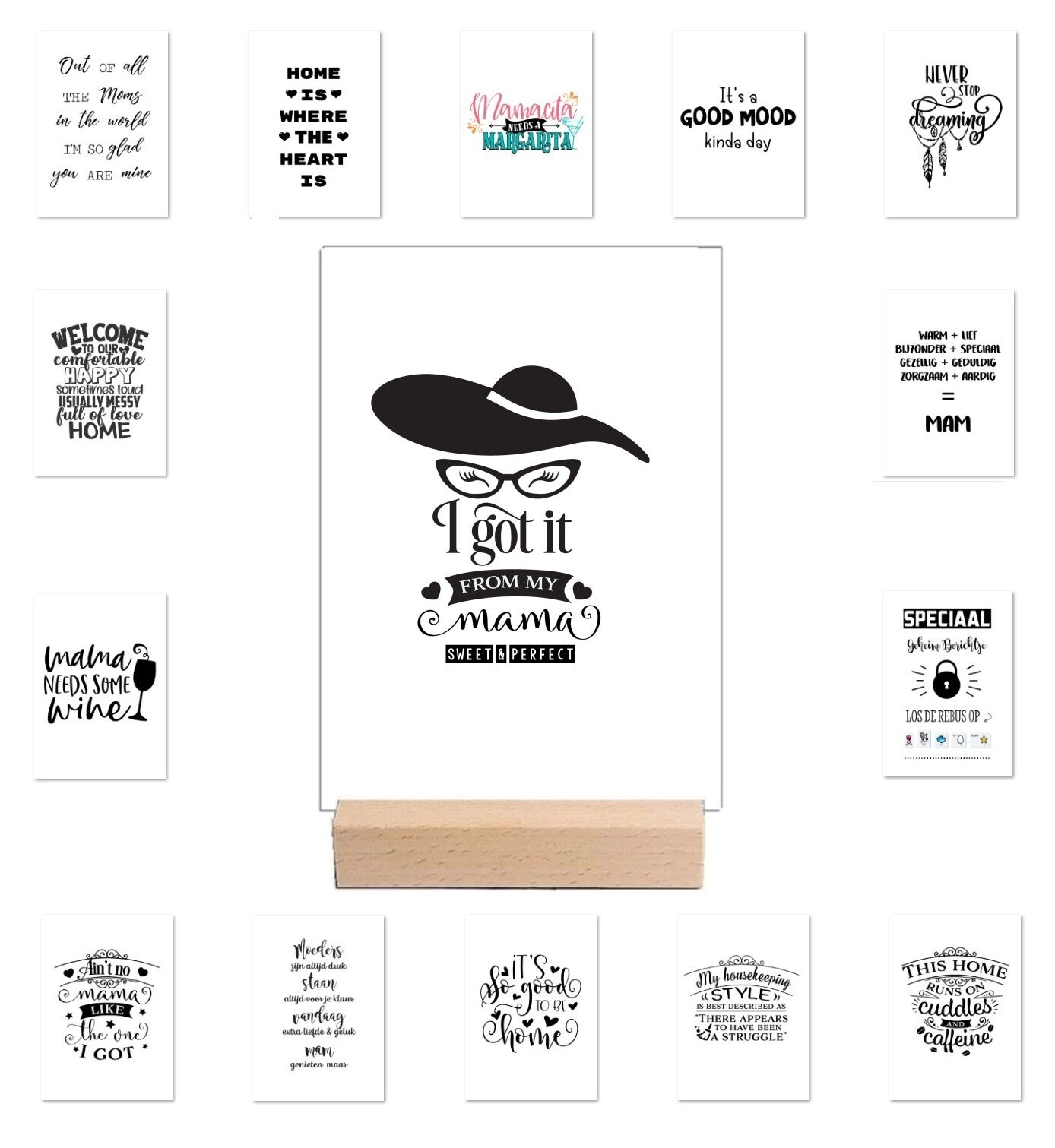 Bedank jou moeder met originele set wenskaarten speciaal gericht op de leukste mama's. 20 stuks in A6 formaat, met mooie en huiselijke quotes en mooie gedichtjes voor je moeder. Hierbij nog een mooie houten standaard om de kaarten in te zetten als echte eyecatcher overal in huis. Een leuk en betaalbaar moederdag cadeau.
