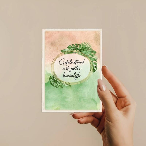 Kleurrijke botanische A6-kaarten met tekst: Gefeliciteerd met jullie Huwelijk. Elke kaart is voorzien van kleurrijke botanische illustraties die warmte en vreugde uitstralen, perfect om een speciale dag nog memorabeler te maken. De stijlvolle tekst "Gefeliciteerd met jullie Huwelijk" maakt de boodschap compleet en voegt een persoonlijke touch toe. Voeg een handgeschreven boodschap toe om het cadeau nog persoonlijker te maken!