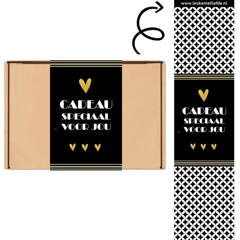 Maak van elk brievenbusdoosje een stijlvol cadeau met je eigen bedrijfsnaam of tekst. Bij allerleileuks.nl vind je de leukste oplossing om van jouw verzenddoosje een prachtig gepersonaliseerd cadeau te maken. Onze handige, bedrukte cadeau wikkels toveren een simpel doosje om tot een feestelijke verrassing. Of je nu een verjaardagscadeau stuurt of iemand zomaar wilt verrassen, onze hippe, gepersonaliseerde wikkels zijn perfect voor het verpakken van brievenbusdoosjes. Kies bijvoorbeeld voor ons stijlvolle zwart-wit ruitdesign met de tekst: "Cadeau speciaal voor jou". Maak indruk met een persoonlijke en stijlvolle verpakking die net dat beetje extra geeft! De wikkels zijn eenvoudig te bevestigen om een doosje. Sluit ze met een transparante ronde sticker, of gebruik leuke stickers met eventueel je eigen link of naam, dat maakt het nog persoonlijker. Maak huwelijksbedankjes , cadeautjes voor klanten of werknemers, of ga je zelf cadeau pakketten verkopen in je shop? Formaat wikkel: ca. 40x10cm geschikt voor A5 doosjes. Prijs vanaf 50 stuks excl. doosjes, koop je meer dan betaal je veel minder.