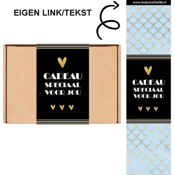Gepersonaliseerde cadeau doos wikkels met blauw goud zeemeermin schubben print: maak van elke verzenddoos een stijlvol cadeau. Wil je een simpele verzenddoos omtoveren tot een prachtig cadeau? Met onze handige en trendy gepersonaliseerde cadeau wikkels geef je elke brievenbusdoos een stijlvolle uitstraling. Kies bijvoorbeeld voor het elegante zwart-wit ruitdesign met de tekst “Cadeau speciaal voor jou” en maak jouw geschenk extra bijzonder. Perfect voor het verpakken van kleine geschenken, verrassingen of persoonlijke items. Ontwerp jouw eigen cadeau wikkels en voeg een unieke, persoonlijke touch toe die gegarandeerd indruk maakt! Wikkels met basis tekst: "Cadeau speciaal voor jou". Maak indruk met een persoonlijke en stijlvolle verpakking die net dat beetje extra geeft! De wikkels zijn eenvoudig te bevestigen om een doosje. Sluit ze met een transparante ronde sticker, of gebruik leuke stickers met eventueel je eigen link of naam, dat maakt het nog persoonlijker. Maak huwelijksbedankjes , cadeautjes voor klanten of werknemers, of ga je zelf cadeau pakketten verkopen in je shop? Formaat wikkel: ca. 40x10cm geschikt voor A5 doosjes. Prijs vanaf 50 stuks excl. doosjes, koop je meer dan betaal je veel minder.