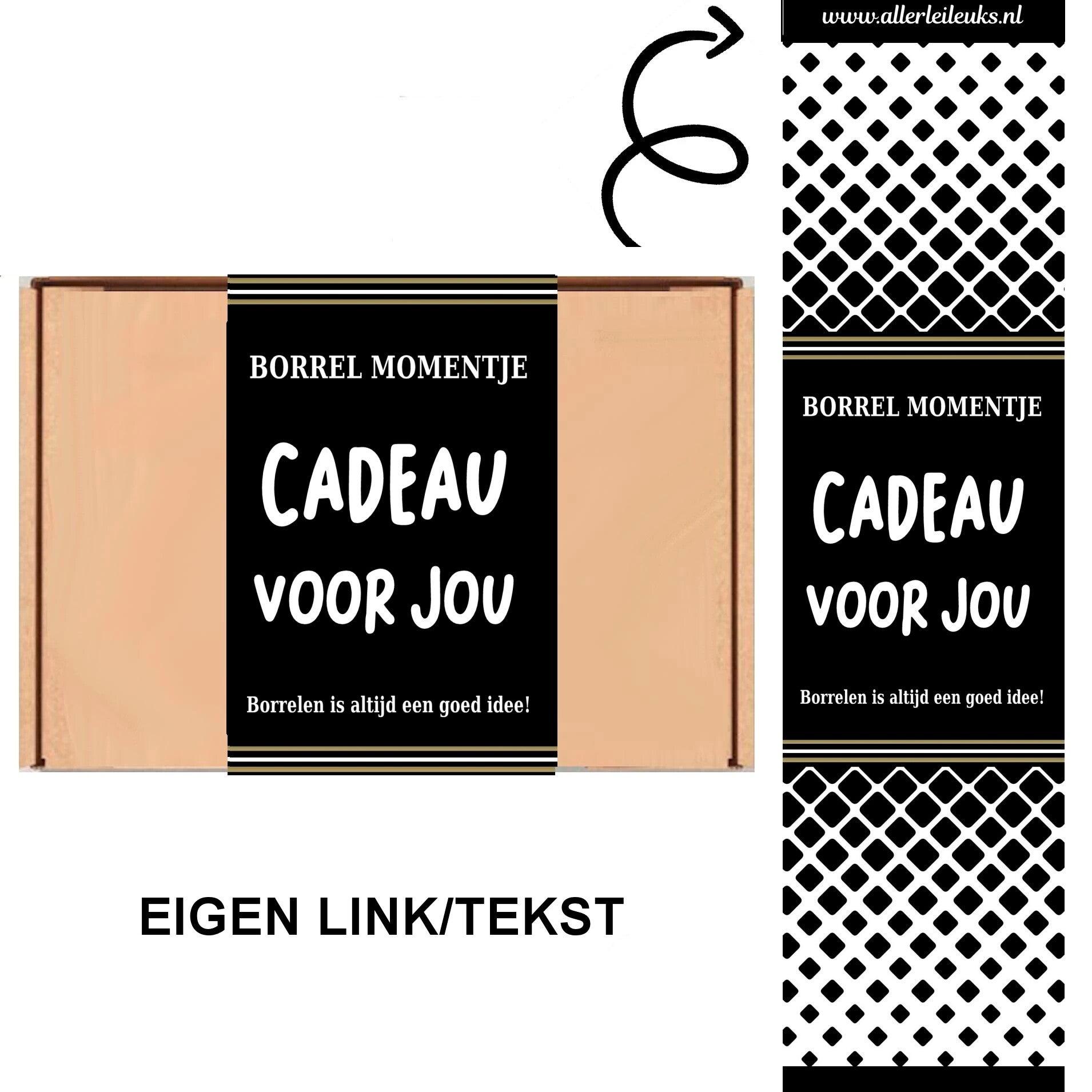 Gepersonaliseerde cadeau wikkels voor een bijzonder borrelmoment. Transformeer jouw borrelpakketje in een uniek en persoonlijk cadeau met onze stijlvolle gepersonaliseerde cadeau wikkels. Ideaal voor het verpakken van cadeau brievenbusdoosjes, maken deze wikkels het eenvoudig om een standaard verzenddoosje om te toveren tot een verrassend en persoonlijk presentje. Kies voor ons elegante zwart-wit design met passende tekst “Borrelmoment” en “Super cadeau voor jou”, Daarnaast is de wikkel te personaliseren met je eigen naam, tekst, of website link, om jouw attentie extra speciaal te maken. Perfect voor elke gelegenheid waarbij je iemand wilt verrassen of bedanken met een eigen samengesteld borrelpakketje! Maak indruk met een persoonlijke en stijlvolle verpakking die net dat beetje extra geeft! De wikkels zijn eenvoudig te bevestigen om een doosje. Sluit ze met een transparante ronde sticker, of gebruik leuke stickers met eventueel je eigen link of naam, dat maakt het nog persoonlijker. Maak bedankjes , cadeautjes voor klanten of werknemers, of ga je zelf cadeau pakketten verkopen in je shop? Formaat wikkel: ca. 40x10cm geschikt voor A5 doosjes. Prijs vanaf 50 stuks excl. doosjes, koop je meer dan betaal je veel minder.