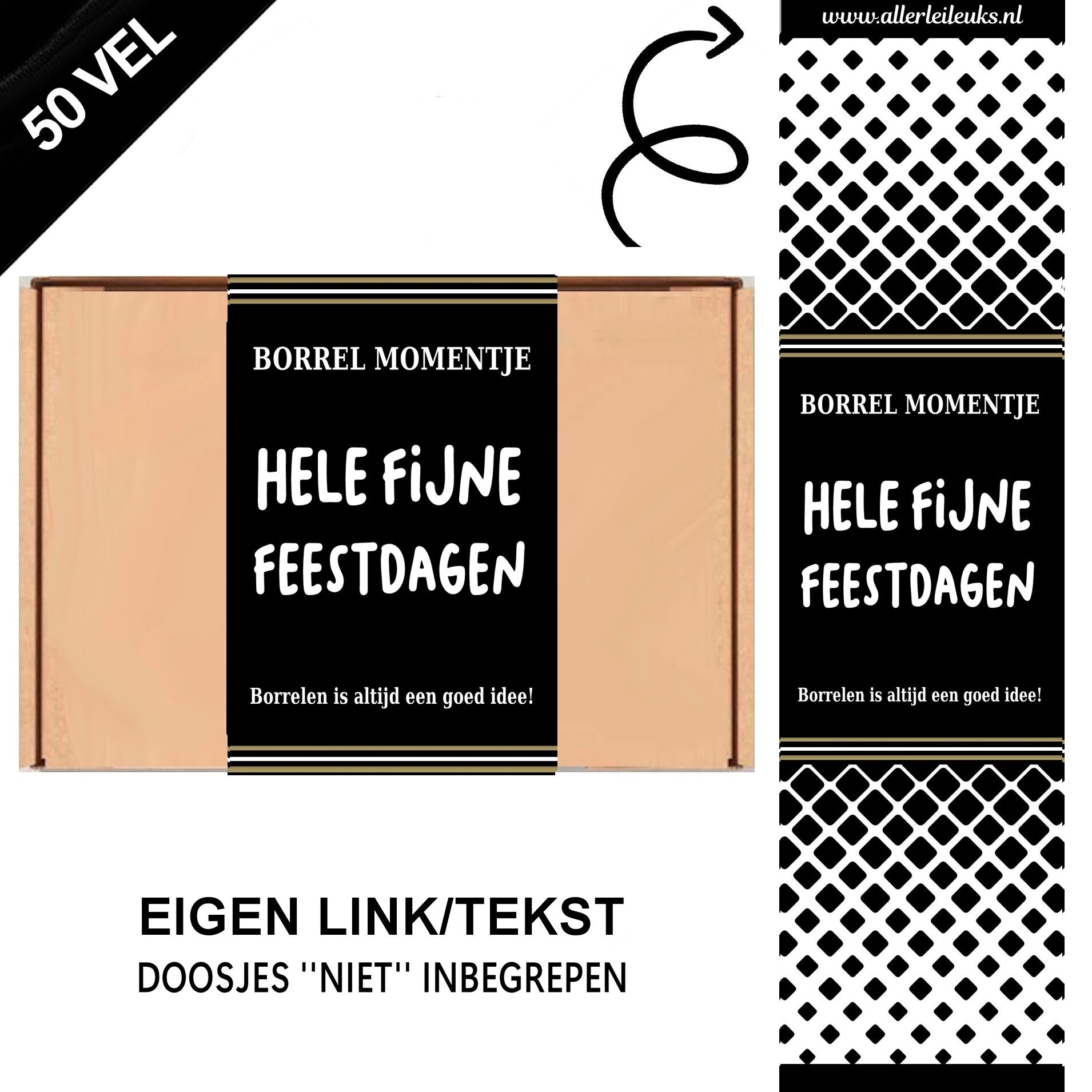 Gepersonaliseerde cadeau wikkels voor een bijzonder Kerst borrelmoment. Transformeer jouw borrelpakketje in een uniek en persoonlijk cadeau met onze stijlvolle gepersonaliseerde cadeau wikkels. Ideaal voor het verpakken van cadeau brievenbusdoosjes, maken deze wikkels het eenvoudig om een standaard verzenddoosje om te toveren tot een verrassend en persoonlijk presentje. Kies voor ons elegante zwart-wit design met passende tekst “Borrelmoment” en “fijne feestdagen”, Daarnaast is de wikkel te personaliseren met je eigen naam, tekst, of website link, om jouw attentie extra speciaal te maken. Perfect voor elke gelegenheid waarbij je iemand wilt verrassen of bedanken met een eigen samengesteld borrelpakketje! Maak indruk met een persoonlijke en stijlvolle verpakking die net dat beetje extra geeft! De wikkels zijn eenvoudig te bevestigen om een doosje. Sluit ze met een transparante ronde sticker, of gebruik leuke stickers met eventueel je eigen link of naam, dat maakt het nog persoonlijker. Maak bedankjes , cadeautjes voor klanten of werknemers, of ga je zelf cadeau pakketten verkopen in je shop? Formaat wikkel: ca. 40x10cm geschikt voor A5 doosjes. Prijs vanaf 50 stuks excl. doosjes, koop je meer dan betaal je veel minder.