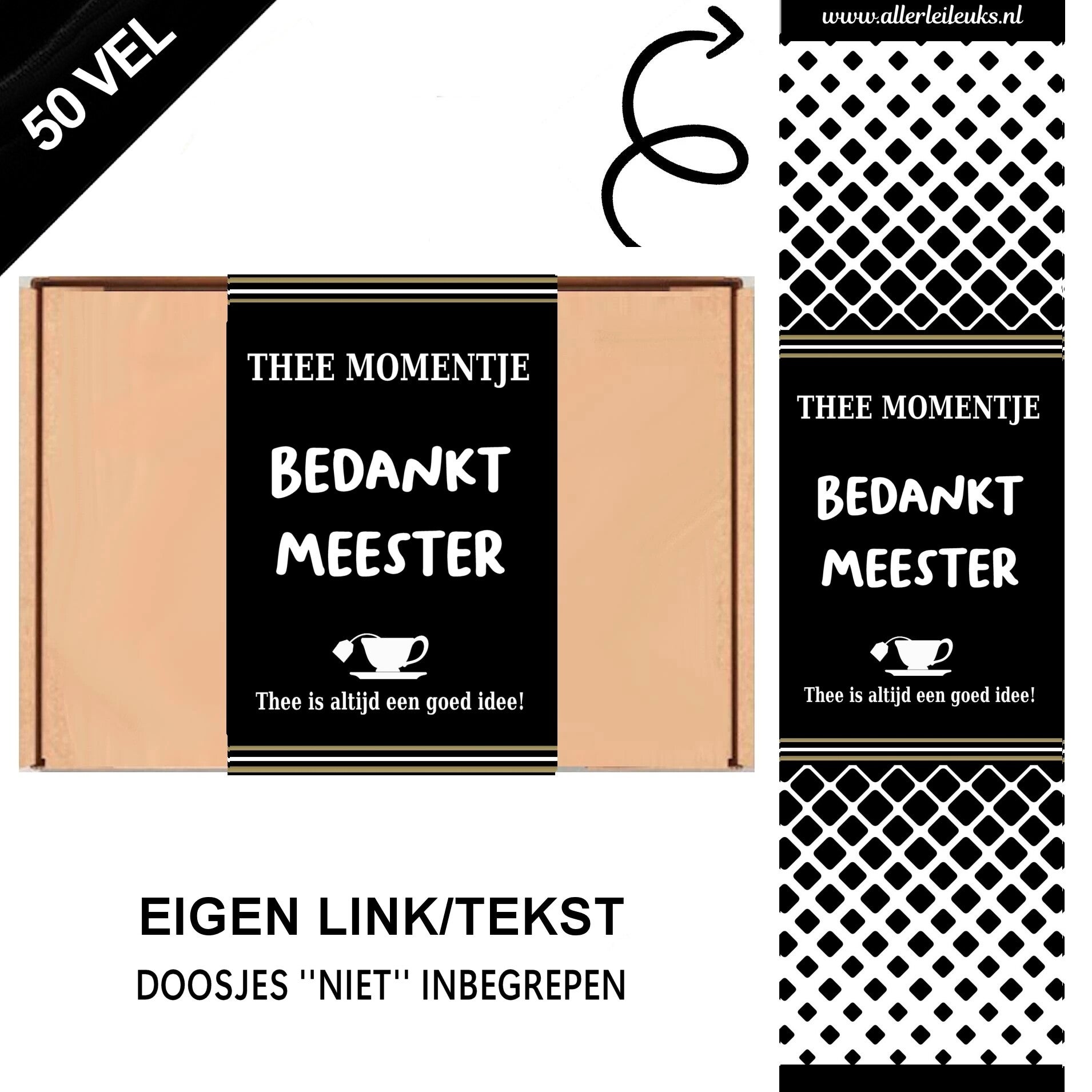 Unieke eigen cadeau wikkels voor thee cadeaupakketjes om je eigen verzenddoosje om te toveren tot een persoonlijk uniek cadeau. Koop bij allerleileuks doos wikkels voor verpakken van cadeau brievenbusdoosjes gevuld met thee en lekkers. In zwart wit design: Theemoment, bedankt meester. Maak je eigen thee bedankjes af in stijl. Maat 40x10cm (A5 doosjes) - 50 stuks - EXCLUSIEF DOOSJES.