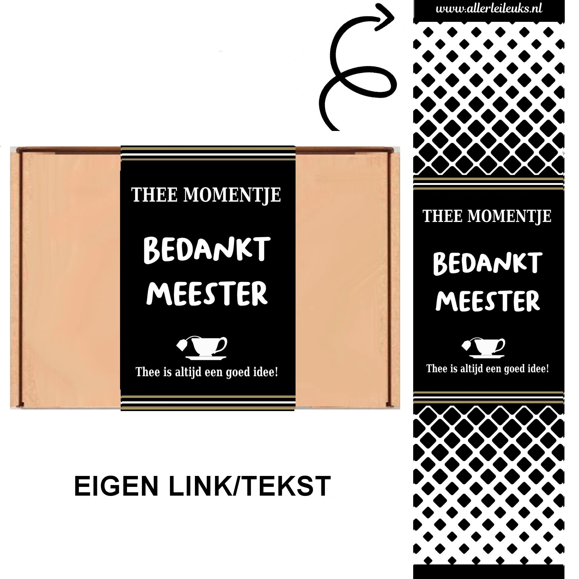 Unieke cadeau wikkels voor thee cadeau pakketjes. Wikkels voor einde schooljaar, afscheid school. Voorzien van basis tekst: Theemoment: bedankt meester, thee is altijd een goed idee! Geef jouw thee cadeau een persoonlijke en unieke touch met onze speciale cadeau wikkels voor theepakketten. Bij Allerleileuks.nl vind je prachtige wikkels om jouw brievenbusdoosjes, gevuld met thee en lekkernijen, om te toveren tot een onvergetelijk cadeau. Deze wikkels zijn ontworpen in een stijlvol zwart-wit design, waardoor ze een moderne en elegante uitstraling hebben. Perfect om een standaard verzenddoosje te transformeren tot een persoonlijk geschenk dat indruk maakt. Ontdek nu ons assortiment wikkels en maak van elk theepakketje iets bijzonders! Perfect voor elke gelegenheid waarbij je iemand wilt verrassen of bedanken met een eigen samengesteld theepakketje! Maak indruk met een persoonlijke en stijlvolle verpakking die net dat beetje extra geeft! De wikkels zijn eenvoudig te bevestigen om een doosje. Sluit ze met een transparante ronde sticker, of gebruik leuke stickers met eventueel je eigen link of naam, dat maakt het nog persoonlijker. Maak bedankjes , cadeautjes voor klanten of werknemers, of ga je zelf cadeau pakketten verkopen in je shop? Formaat wikkel: ca. 40x10cm geschikt voor A5 doosjes. Prijs vanaf 50 stuks excl. doosjes, koop je meer dan betaal je veel minder.