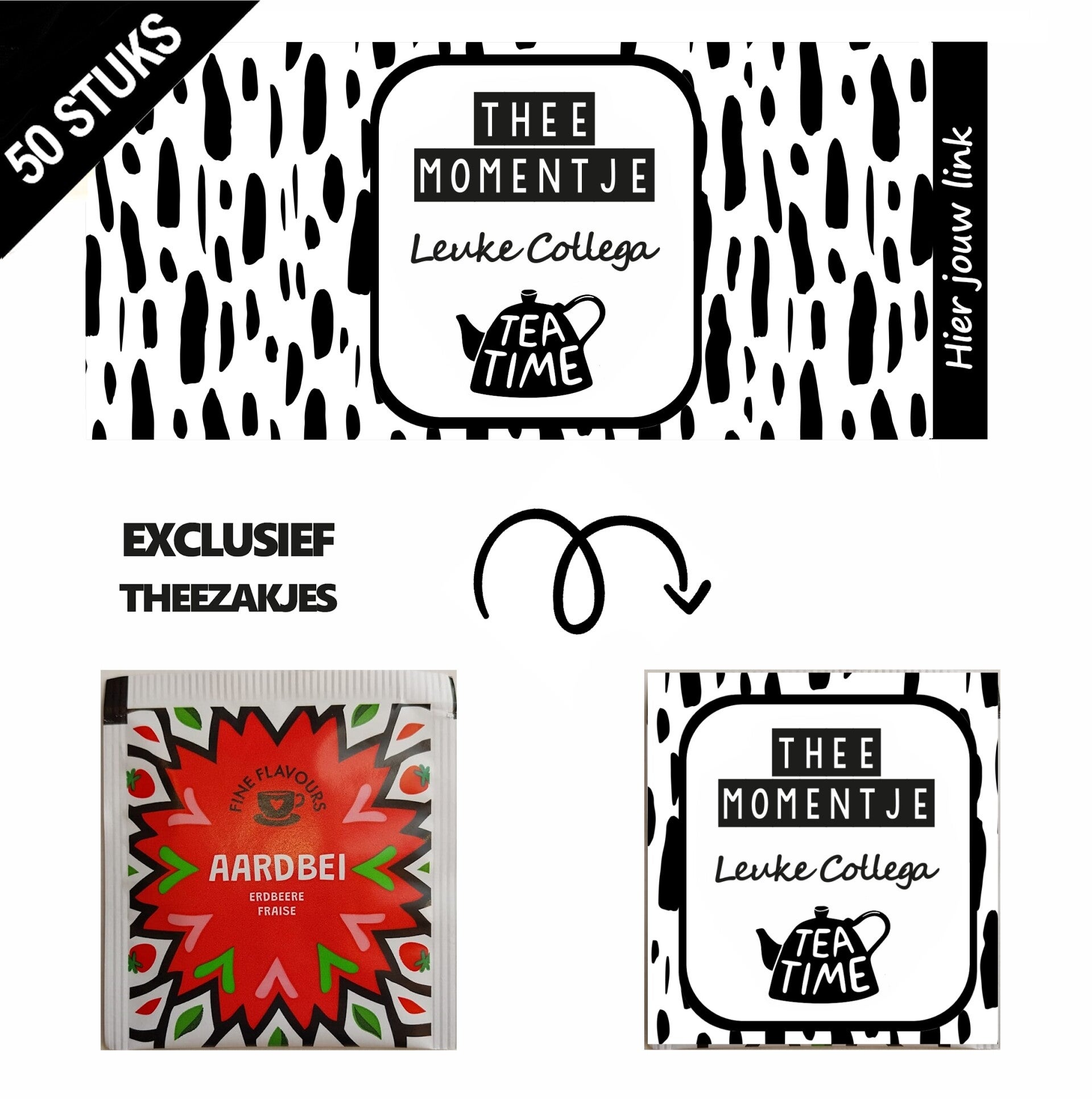 Persoonlijke theezakjes als attentie voor jouw collega's. Met de wikkels van allerleileuks.nl maak je in een handomdraai leuke, persoonlijke theezakjes. Perfect om een bijzonder thee-momentje cadeau te geven aan je collega’s bij een afscheid, pensioen of als bedankje. Verras ze met een uniek 'theemomentje leuke collega' waarmee je laat zien hoeveel je hun samenwerking waardeert. Met deze hippe DIY-theezakjes geef je een originele en persoonlijke attentie die altijd in de smaak valt! De theezakjes in hun persoonlijke wikkel zorgen gegarandeerd voor een glimlach. Super leuk om zelf originele bedankjes te maken voor vele gelegenheden. Ideaal als bedankje voor particulieren, maar ook voor winkels en bedrijven om cadeaus te maken voor medewerkers of voor wederverkopers! Vanaf 50 stuks, formaat wikkels: lengte: 16cm, hoogte 7,5cm. Plak de wikkels vast met een sticker of plakbandje.
