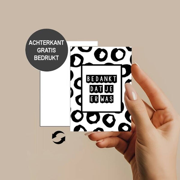 Cadeau kaartjes in zwart-wit: Bedank je gasten of klanten in stijl. Laat een blijvende indruk achter met onze stijlvolle cadeau kaartjes in zwart-wit, voorzien van de tekst: "Bedankt dat je er was." Deze handige kaartjes zijn perfect voor diverse gelegenheden, zoals feesten, evenementen, beurzen of zelfs je bruiloft. Ze bieden een eenvoudige en elegante manier om je gasten of klanten te bedanken en te laten zien hoeveel je hun aanwezigheid waardeert. Wil je een persoonlijke touch toevoegen? Je kunt de kaartjes gemakkelijk personaliseren met je eigen boodschap. Of het nu gaat om een zakelijke relatie of een intieme viering, deze kaartjes zijn de perfecte keuze om je waardering te tonen. Trendy betaalbare wenskaartjes voor uitdelen en weggeven. Handige cadeau kaartjes om cadeau te doen of toe te voegen aan een leuke presentjes. Geschikt voor particulieren, bedrijven, wederverkopers, winkels en webshops. Prijs is vanaf 50 stuks, koop meer en betaal minder. Formaat: A7 formaat. 10,5 x 14,8 cm - enkele kaartjes zonder enveloppen.