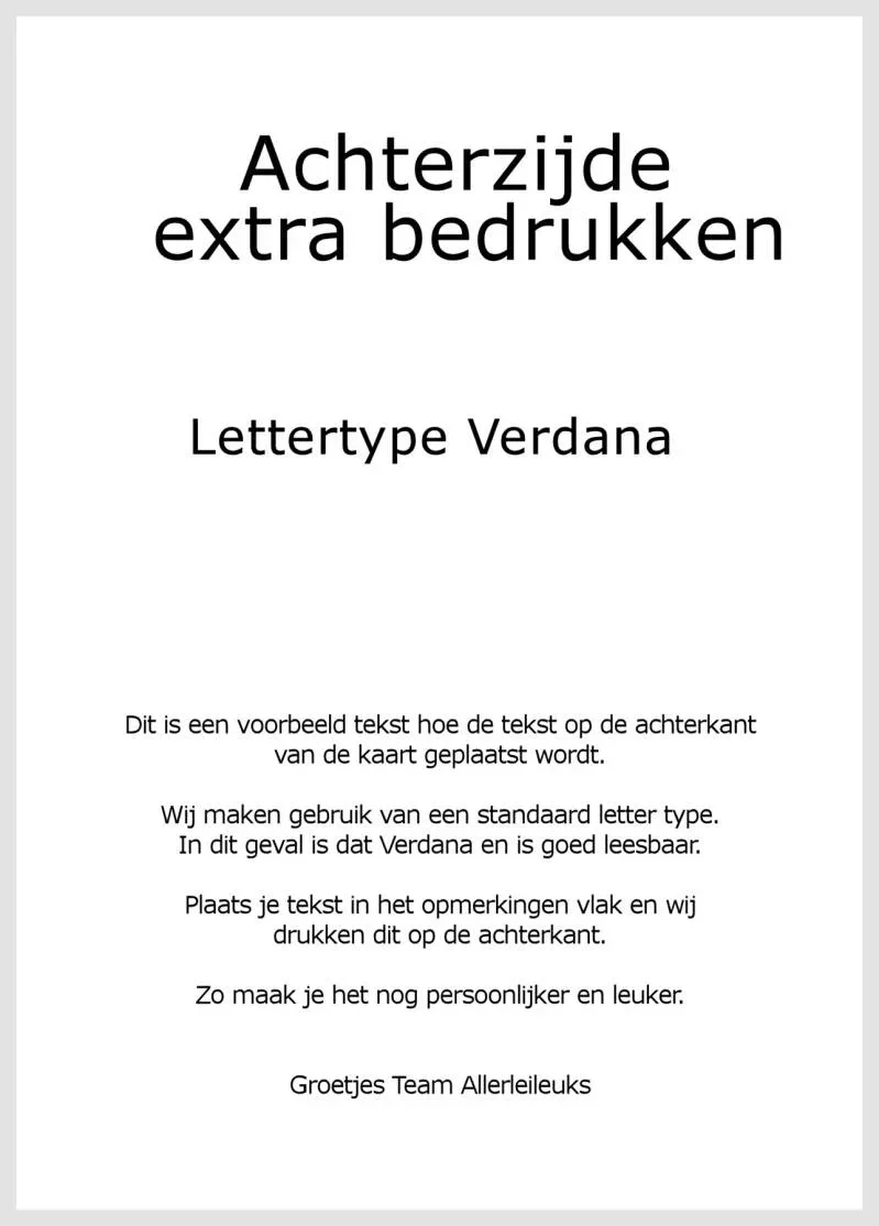 Wij kunnen kosteloos de achterkant extra voor je bedrukken met je eigen tekst. lettertype is standaard Verdana.