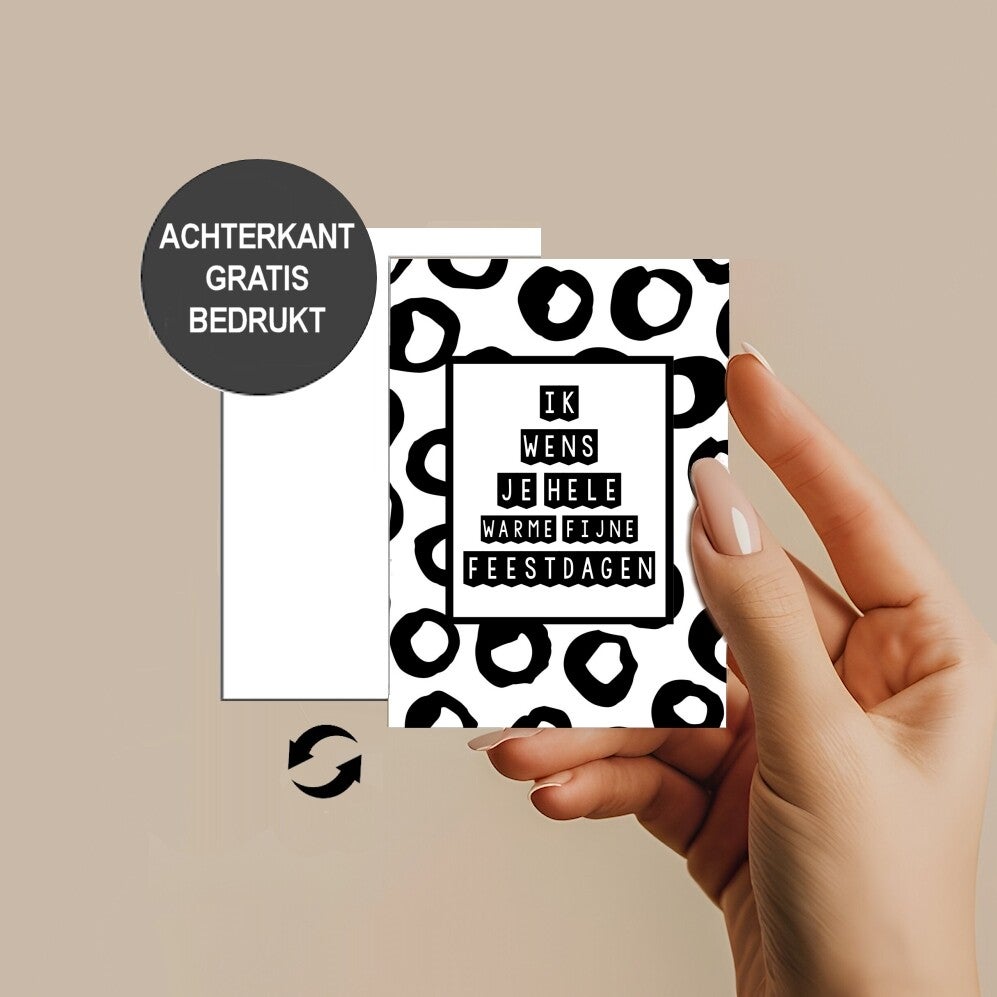 Kleine gepersonaliseerde Kerst kaartjes. Op zoek naar stijlvolle en handige kaartjes voor de feestdagen? Onze kleine kerst kaartjes in zwart-wit zijn perfect om een persoonlijke touch toe te voegen aan elk cadeautje. Met de tekst "ik wens je warme, fijne feestdagen" zijn ze ideaal om je waardering te tonen tijdens de feestdagen/ Kerstdagen. Deze kaartjes zijn niet alleen al mooi in hun eenvoud, maar ook te personaliseren met je eigen boodschap. Of je ze nu los geeft tijdens Kerstmis of toevoegt aan een Kerst cadeau pakket, ze zorgen altijd voor een warme en persoonlijke uitstraling. Geschikt voor zowel particulieren als bedrijven! Trendy betaalbare wenskaartjes voor uitdelen en weggeven. Handige cadeau kaartjes om cadeau te doen of toe te voegen aan een leuke presentjes. Geschikt voor particulieren, bedrijven, wederverkopers, winkels en webshops. Prijs is vanaf 50 stuks, koop meer en betaal minder. Formaat: A7 formaat. 10,5 x 14,8 cm - enkele kaartjes zonder enveloppen.