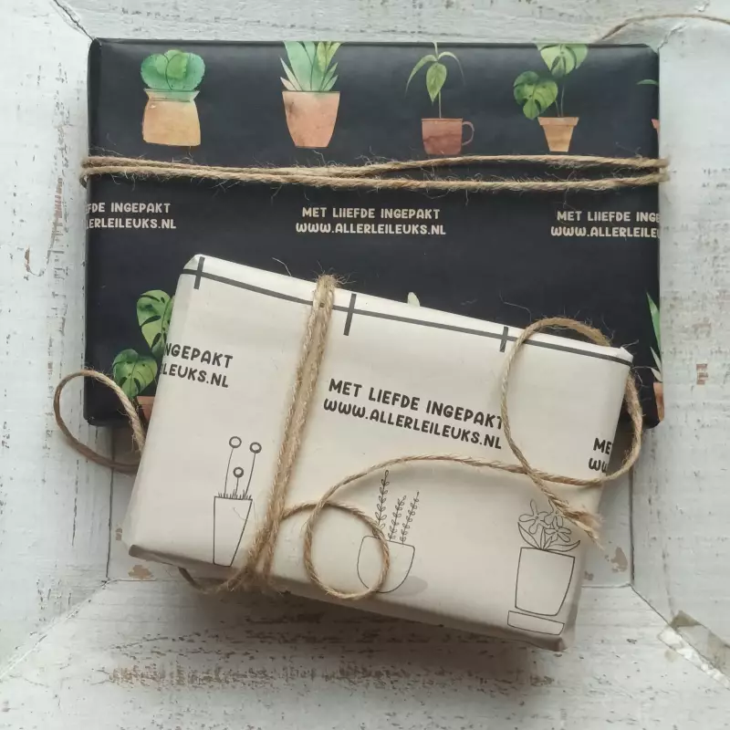 Unieke en milieuvriendelijk cadeaupapier met jou bedrijfsnaam. Geef je cadeaus een persoonlijke en professionele touch met ons unieke eco cadeaupapier! Laat je inpakpapier bedrukken met jouw bedrijfsnaam of websitenaam en straal jouw stijl uit. Het prachtige botanische plantenontwerp in crème en zwart zorgt voor een elegante uitstraling die past bij iedere gelegenheid. De inpakvellen van allerleileuks.nl zijn milieuvriendelijk en perfect om je geschenken op een duurzame manier te verpakken. Kies voor stijlvol en groen: inpakken en uitdelen in jouw eigen unieke stijl! Koop je eigen inpakvellen met de naam van je shop of winkeltje. Mooi vellen cadeaupapier met botanische planten in crème kleur. Super Leuk en gemakkelijk om mee in te pakken, en je maakt gelijk reclame voor je bedrijfje of shop. De vellen zijn aan 1 zijde bedrukt. Mooi in combinatie met zwart of naturel versiering. Geeft gelijk een trendy sfeer aan ieder mooi verpakt cadeau. Geschikt voor A5 en A6 doosjes over dwars, en vele andere kleine pakjes. Maat vellen ca. A3 (29,7x42cm), 70 grams papier. Prijs is vanaf 50 vellen, excl. voorbeeld materialen. Meer bestellen is nog goedkoper, check de staffelprijzen.
