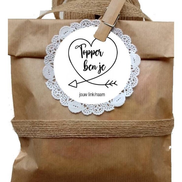 Hoe leuk deze mooie ronde persoonlijke cadeau labels: ''Topper Ben Je''! Gepersonaliseerd met je eigen korte tekst of link. Bij allerleileuks.nl koop je hippe betaalbare persoonlijke cadeau labels als bedankjes voor klanten, personeel, familie of vrienden. Een hart onder de riem op een persoonlijke manier. Prijs vanaf 50 stuks labels excl. voorbeeldmaterialen. Verkrijgbaar in wit of eco karton. Formaat 8cm zonder gat.
