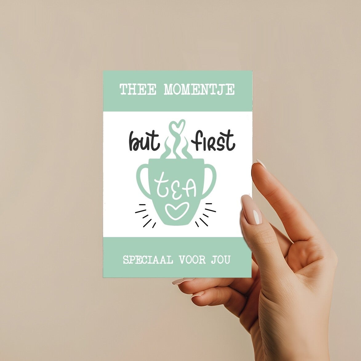 Leuke Theekaarten voor Elke Theeliefhebber, Gratis te personaliseren! Op zoek naar een uniek en persoonlijk cadeau voor een theeliefhebber? Onze leuke theekaarten zijn perfect om samen met een theetje cadeau te geven of toe te voegen aan een thee cadeau pakket. Met vrolijke teksten zoals "But first, tea" en "Speciaal voor jou", maak je elk theemoment extra bijzonder. Deze prachtige A6-wenskaarten zijn speciaal ontworpen voor de echte theeleuten, want laten we eerlijk zijn: thee is altijd een goed idee! Ontdek onze enkele kaarten in handig A6-formaat en geef een glimlach cadeau met een persoonlijke touch. Handige cadeau kaarten om cadeau te doen of toe te voegen aan een leuke presentjes. Zeer geschikt voor theewinkels, theehuizen, theetuinen, thee schenkerij, perfect voor bij een high tea, voor particulieren, bedrijven en webshops. Prijs is vanaf 10 stuks, koop meer en betaal minder. Formaat: A6 formaat. 10,5 x 14,8 cm - enkele kaarten.