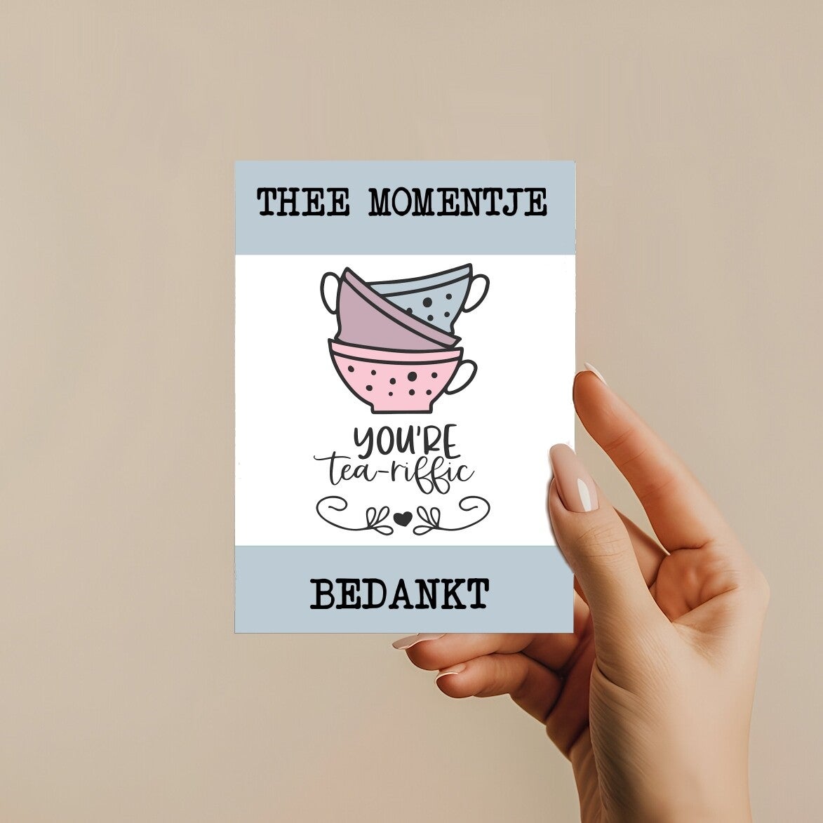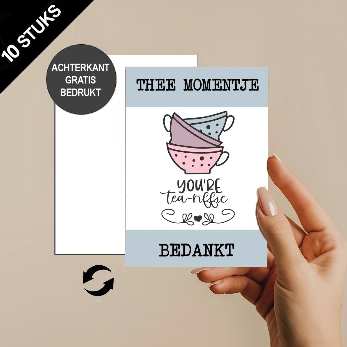 Leuke Thee Kaarten voor Theeliefhebbers als bedankje. Ook gratis te personaliseren met eigen tekst. Maak een cadeautje extra bijzonder met onze leuke thee kaarten! Perfect om iemand te bedanken met een theetje cadeau of om toe te voegen aan een thee cadeau pakket. Deze vrolijke A6 wenskaarten zijn speciaal ontworpen voor echte theeliefhebbers. Met een leuke tekst zoals "You are tea-riffic, bedankt" geef je jouw cadeautje een persoonlijke touch. Thee is altijd een goed idee als cadeau, en met deze kaarten maak je het helemaal af. Perfect voor elke gelegenheid waar een kopje thee en een glimlach centraal staan! Ontdek onze enkele kaarten in handig A6-formaat en geef een glimlach cadeau met een persoonlijke touch. Handige cadeau kaarten om cadeau te doen of toe te voegen aan een leuke presentjes. Geschikt voor particulieren, bedrijven, winkels en webshops. Prijs is vanaf 10 stuks, koop meer en betaal minder. Formaat: A6 formaat. 10,5 x 14,8 cm - enkele kaarten.